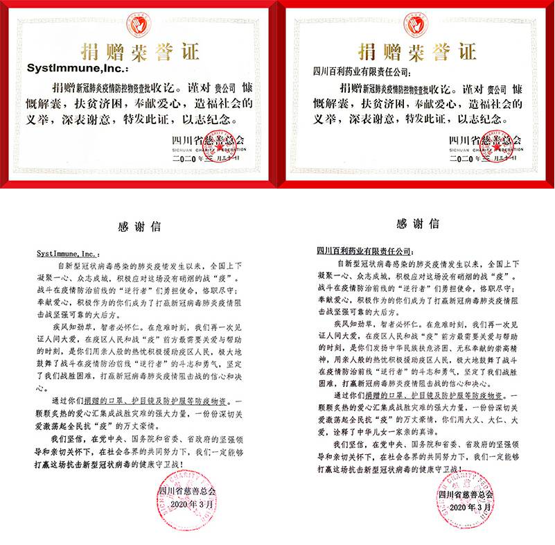 2016年和2017年,向四川省医药爱心扶贫基金会首批医疗爱心救助项目捐赠,荣获“爱心捐赠单位”称号。